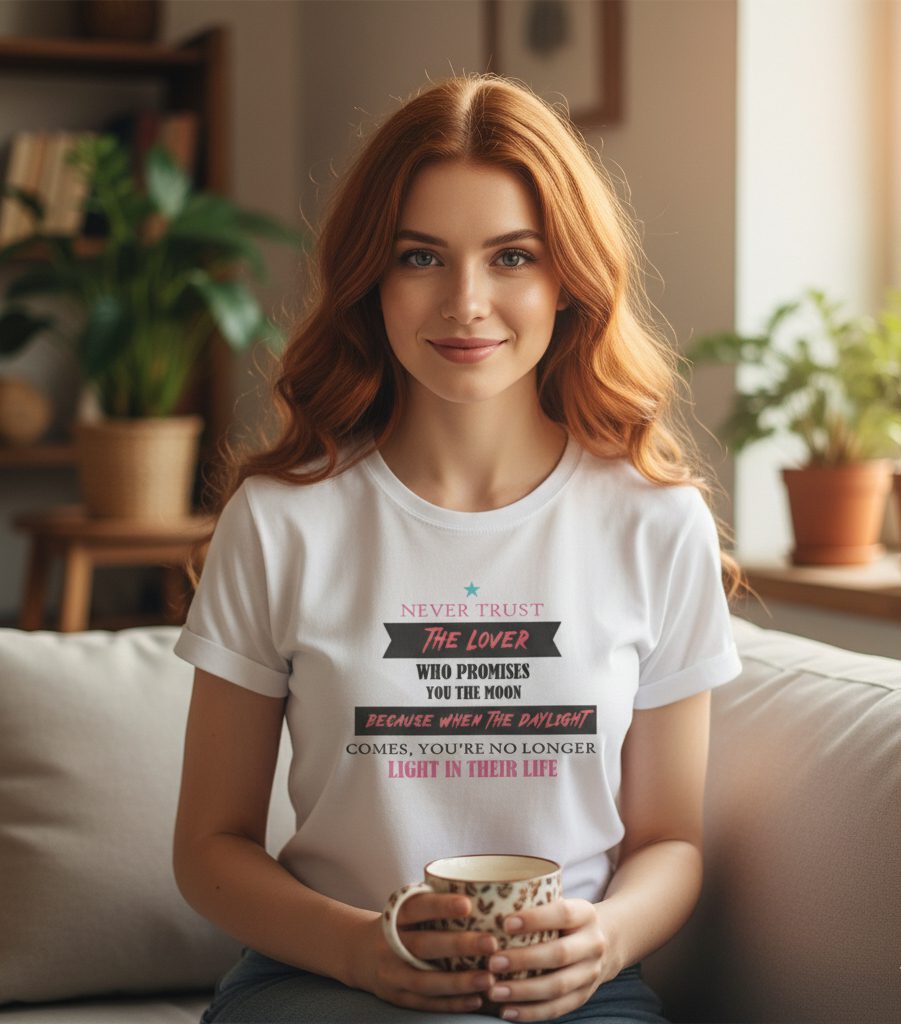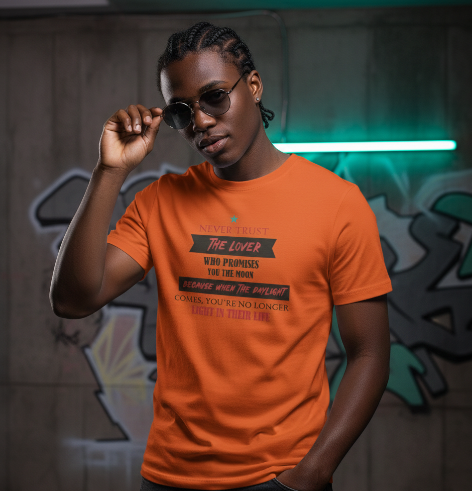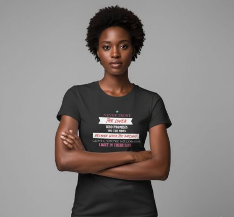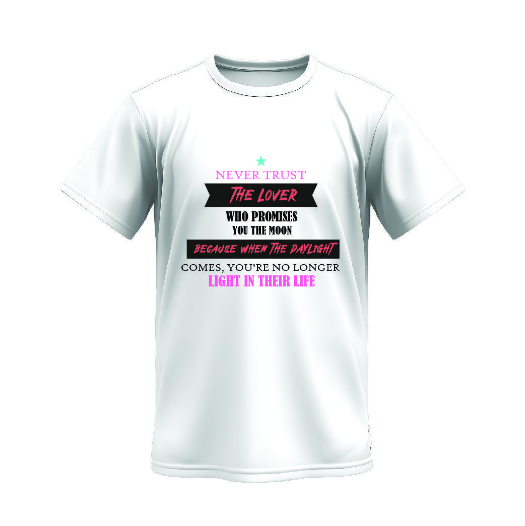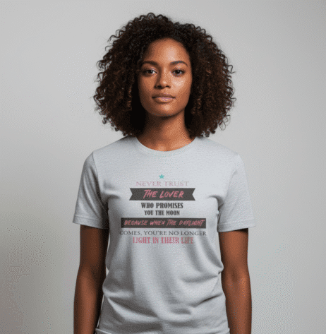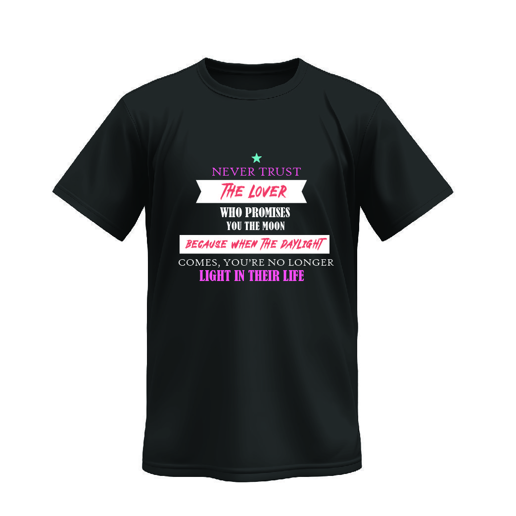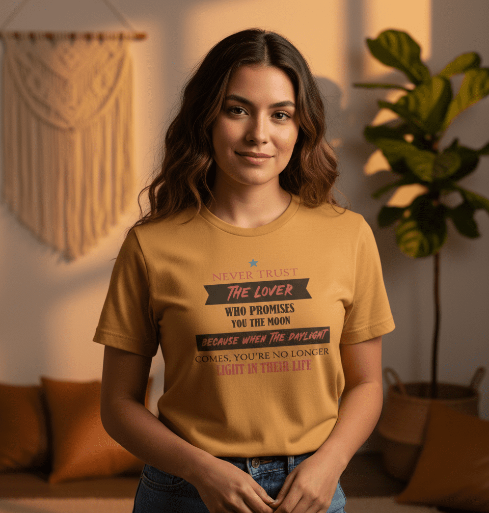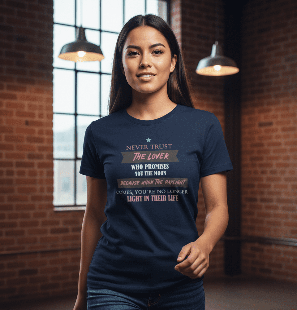“Never Trust The Lover Who Promises You The Moon” Vivid Tee serves as a reminder to value honesty and realistic expectations in relationships. When daylight comes, unrealistic promises often vanish, leaving disappointment. Made from soft cotton, this Vivid Tee is perfect for anyone committed to authentic relationships and emotional self-awareness.