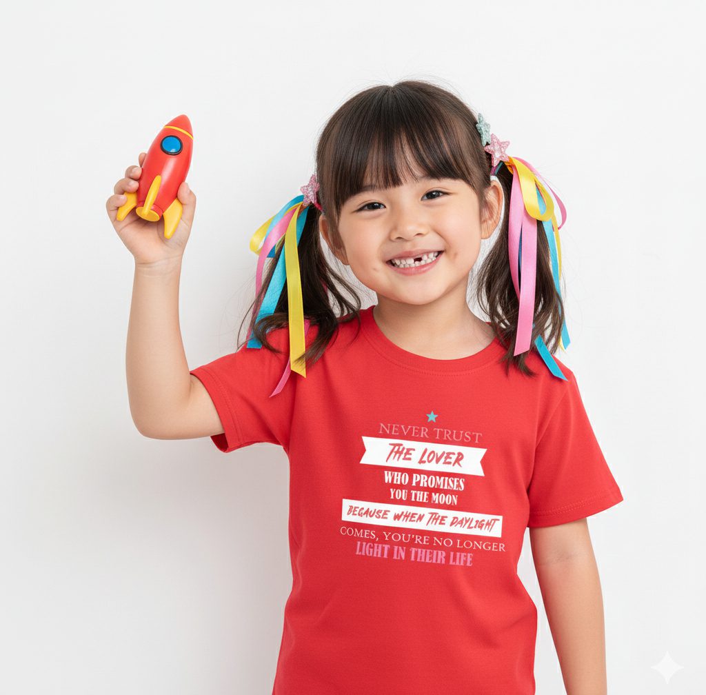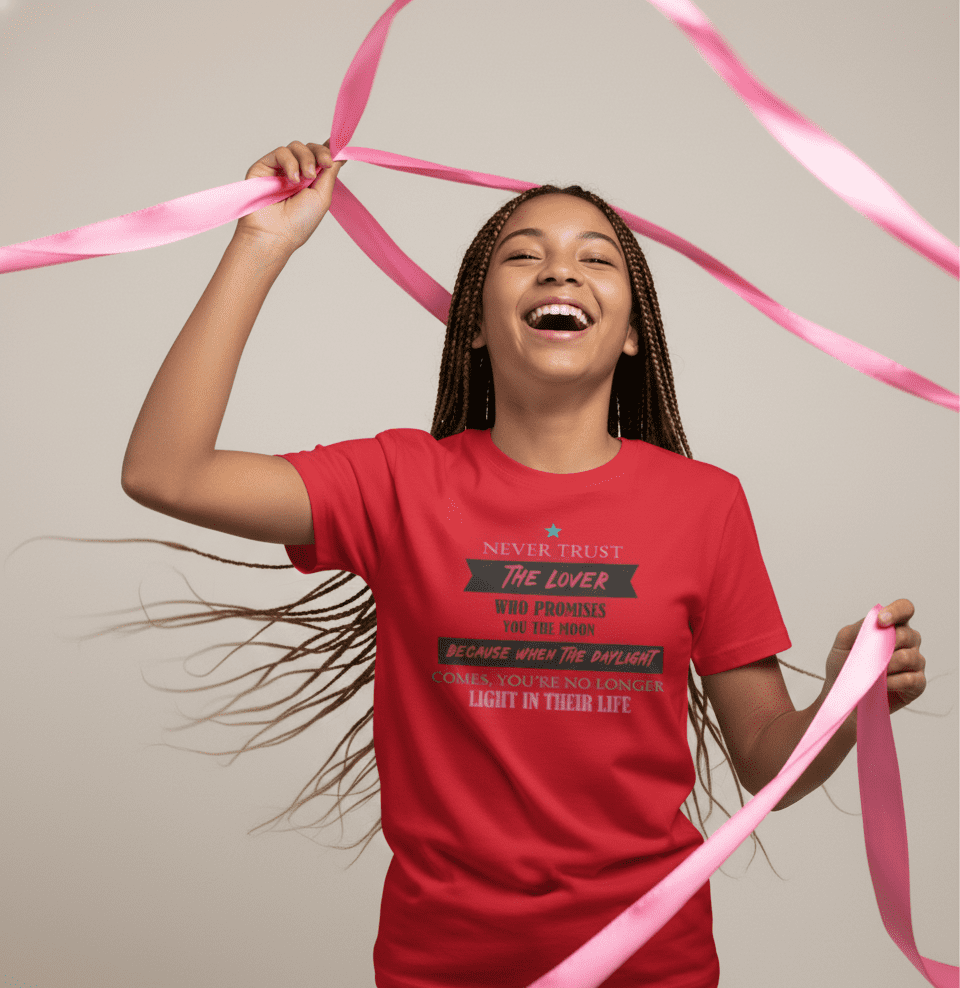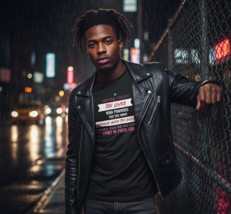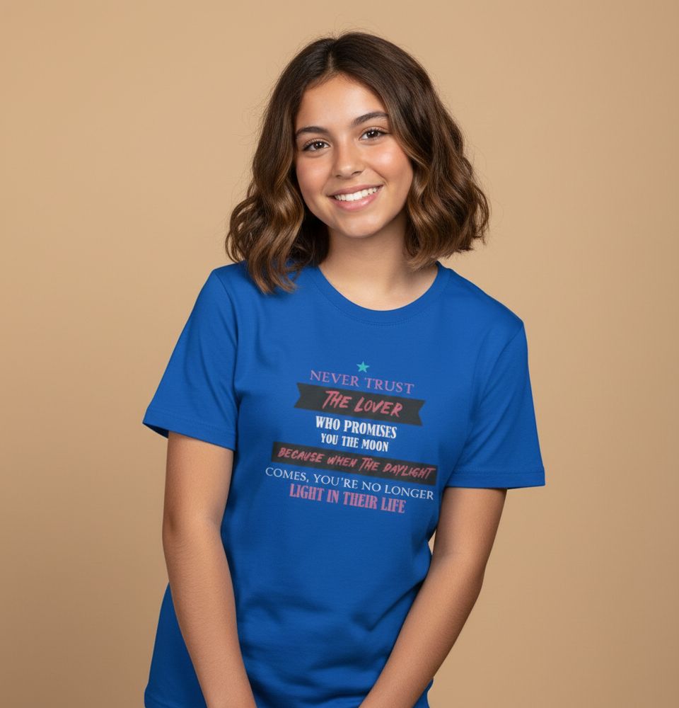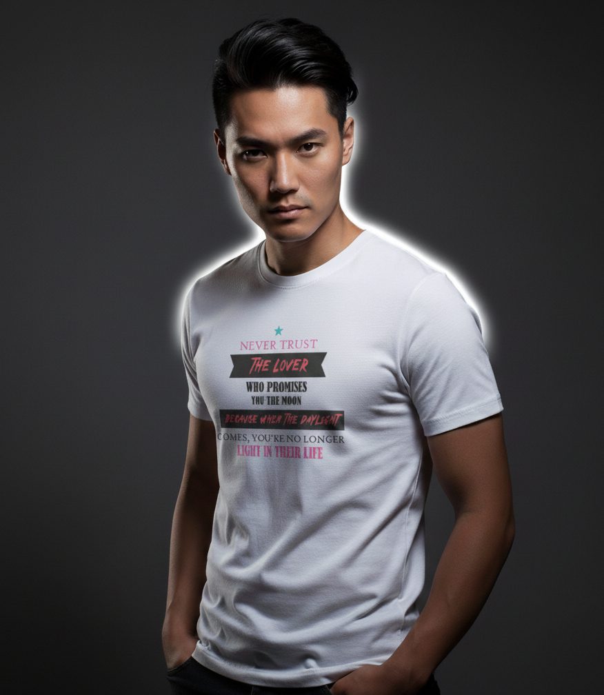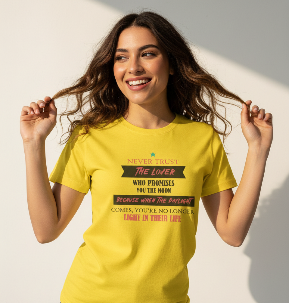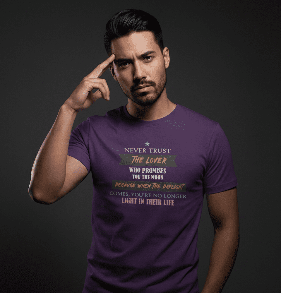 “Never Trust The Lover Who Promises You The Moon” Vivid Tee serves as a reminder to value honesty and realistic expectations in relationships. When daylight comes, unrealistic promises often vanish, leaving disappointment. Made from soft cotton, this Vivid Tee is perfect for anyone committed to authentic relationships and emotional self-awareness.