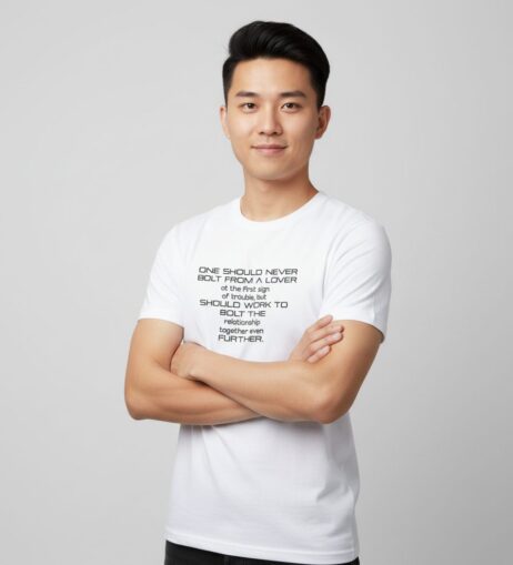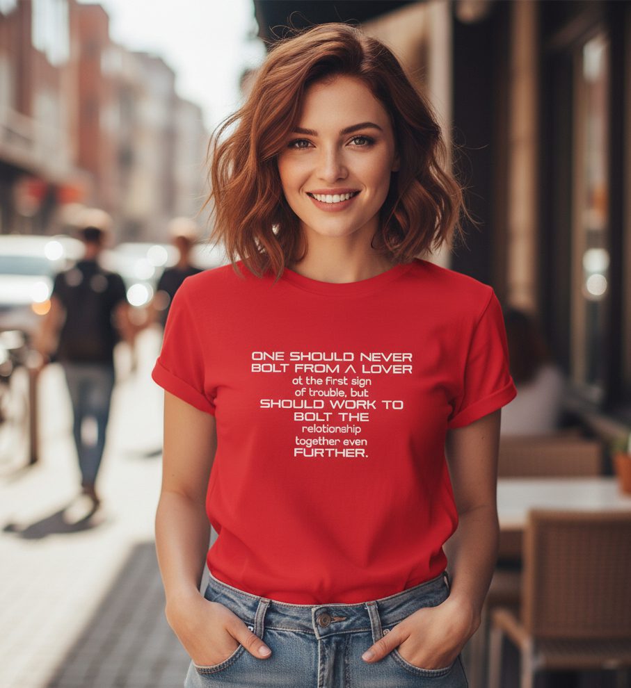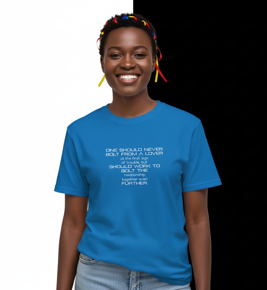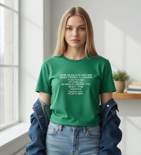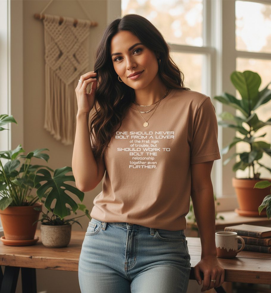 “One Should Never Bolt From A Lover” Monochrome Tee emphasizes the importance of nurturing